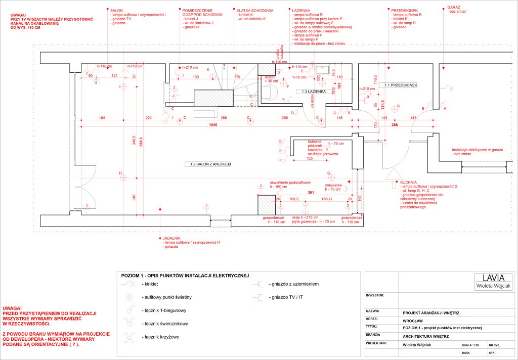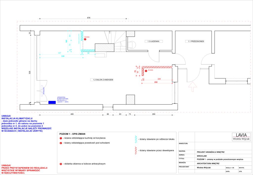 Poniżej pokazuję przykładowy projekt zmian dotyczący nowych ścian oraz instalacji elektrycznych w domu w zabudowie szeregowej. Do tego projektu dołączony był jeszcze projekt zmian instalacji wod.-kan. oraz wszelkie zmiany, które zostały przygotowane także dla piętra.